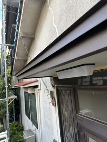 現地調査を行ったところ、庇部分に竪樋が接続されており、雨水が溜まりやすい構造になっていました。